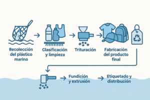 El reciclaje del plásticos marinos para crear productos de merchandising es un proceso que involucra varias fases. Desde la recolección de plásticos en el océano hasta la creación de artículos promocionales sostenibles, cada etapa es crucial para garantizar que el proceso sea efectivo y que los productos resultantes sean de alta calidad. A continuación, detallamos las fases más importantes:
